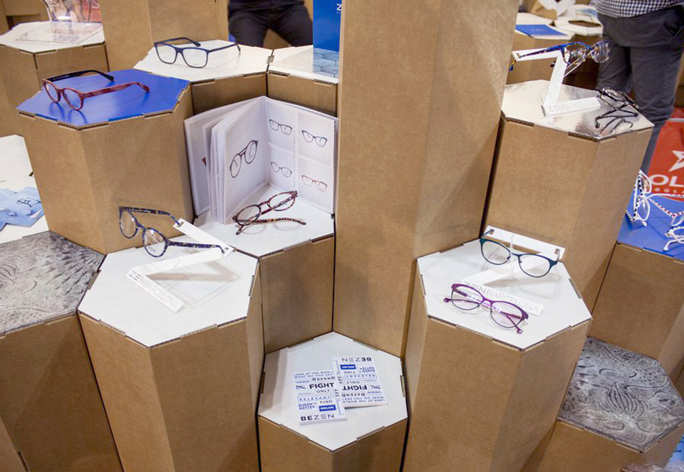 Determinadas formaciones minerales, como las columnas de basalto,  pueden encontarse espontáneamente en la naturaleza formando espectaculares construcciones hexagonales. Un ejemplo de ello es  la Calzada del Gigante (Irlanda). Siguiendo esta geometría, e  inspirándonos en las proporciones de la baldosa hexagonal hidráulica de Gaudí que pavimenta el Paseo de Gracia de Barcelona diseñamos  un stand de módulos hexagonales para la óptica Zen. Módulos de cartón de diferentes alturas, formando una composición visual única. Se utilizaron para mostrar gafas y como piezas de mobiliario. Con el tiempo, el tótem hexagonal de cartón inspirado en el stand de Zen se ha convertido en un elemento expositivo habitual de nuestro catálogo.