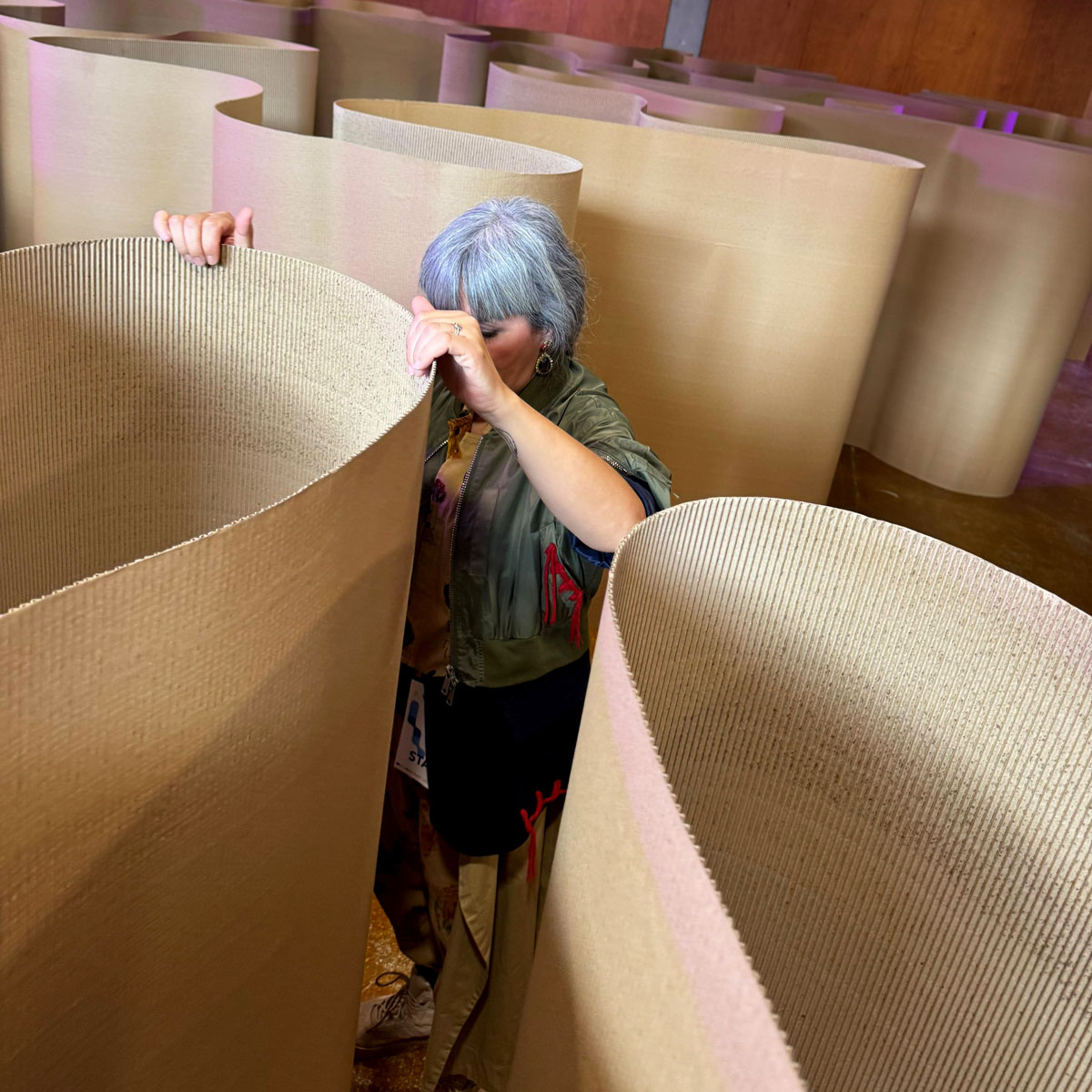 La pequeña aventura de perderse un rato de forma lúdica durante un evento es una experiencia muy tentadora. Nuestras compañeras de Circúbica lo tuvieron claro, y con un sencillo rollo de cartón corrugado y muchos metros disponibles montaron una divertida instalación que ejercía de laberinto. Para dotar de estabilidad el montaje, diseñamos unos tótems personalizados que sirvieron además, para troquelar la gráfica corporativa sobre el cartón.