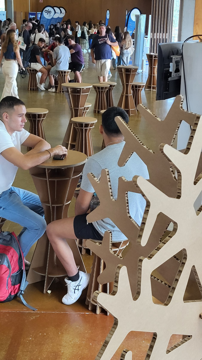 Los eventos corporativos o institucionales se suelen prolongar durante varias horas, así que es habitual que cuenten con zonas de descanso en las que sentarse un rato. Las gradas de cartón permiten que mucha gente se siente a la vez en un mismo espacio, así como atender a las diversas intervenciones o actos que se realicen sin necesidad de estar de pie. Su estructura resistente combinada con la ligereza (se puede trasladar de un sitio a otro con facilidad) lo convierte en un mueble de lo más versátil para espacios de este tipo.