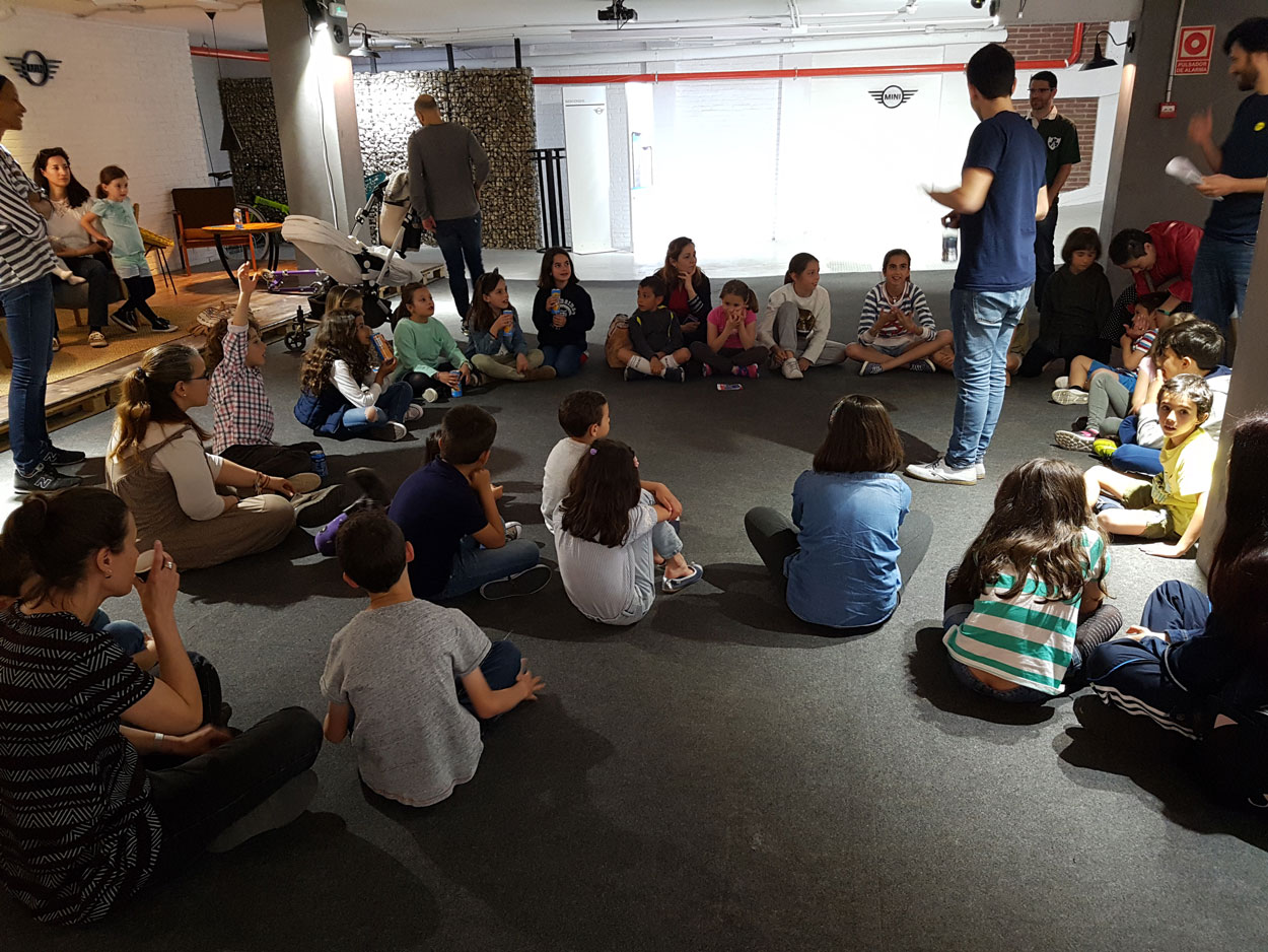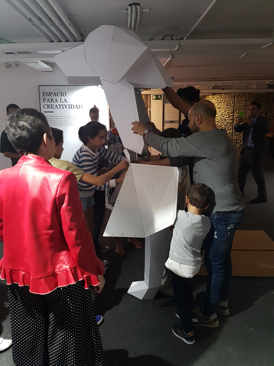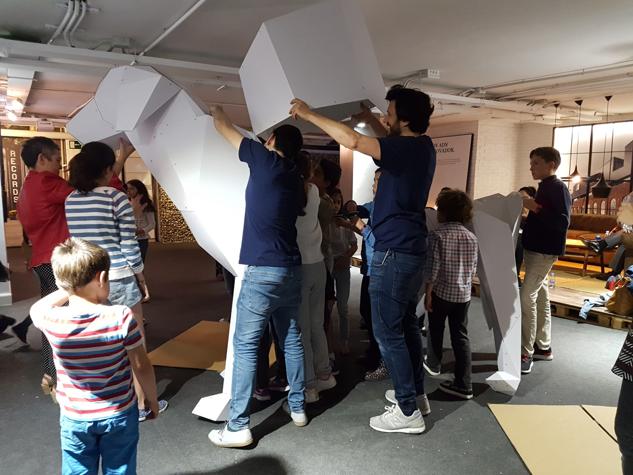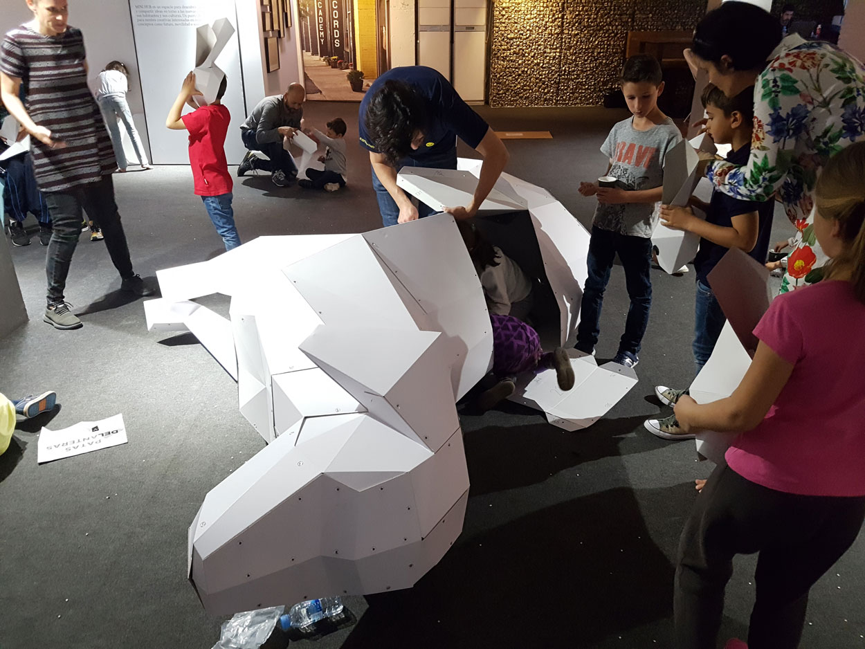 En el taller participaron 30 niños de diferentes edades comprendidas entre los 6-12 años. El montaje de esta figura de cartón de gran formato se llevó a cabo en 2 horas, durante las cuales los niños se dividieron por equipos según las distintas partes del cuerpo del animal.