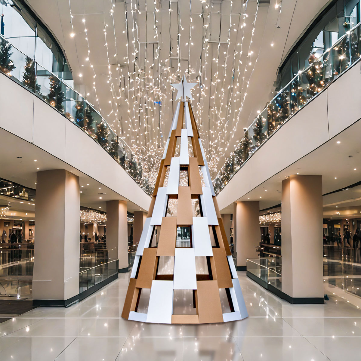El árbol de Navidad Temaki tiene 4m de altura y es un recurso decorativo ideal para grandes espacios. Está diseñado en cartón y tiene dos grandes ventajas: es muy ligero para su tamaño y su transporte en paquete plano facilita mucho la recepción del pedido.