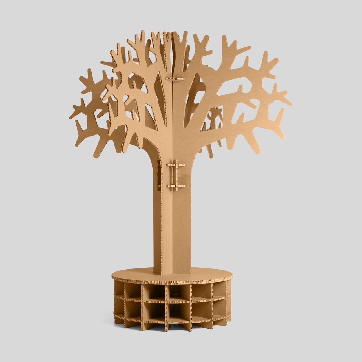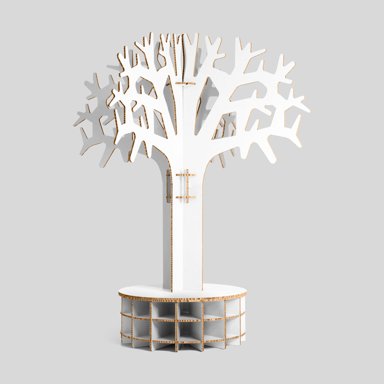Banco-árbol de cartón Branch. Resistente y reutilizable. Perfecto para eventos, zonas de descanso y espacios efímeros. Cubre las necesidades prácticas y decorativas, que muchas veces se cruzan en el diseño sostenible para eventos. Su diseño ligero y fácil de montar lo hace ideal para quienes buscan soluciones sostenibles y funcionales. Un árbol decorativo que te ayudará a crear espacios de atención al público más acogedores. Podemos producirlo en acabado marrón kraft, pero también en blanco, o personalizarlo con impresión digital.