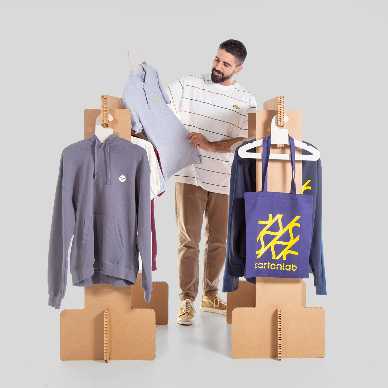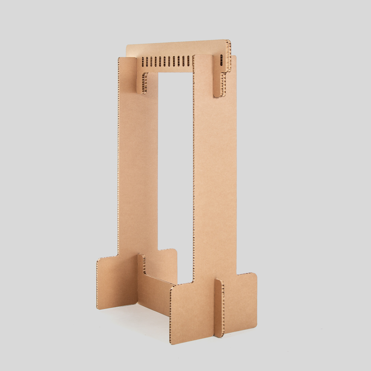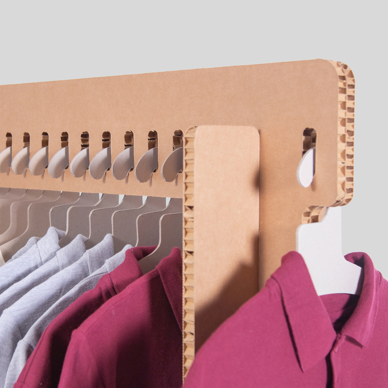 Pack 2 unidades. Burro para ropa. Colgador resistente y desmontable realizado en cartón estructural nido de abeja. Muy ligero y fácil de transportar. Una solución perfecta para mercadillos, pop-up stores, showrooms, sesiones de fotografía, desfiles de moda etc. Cada burro se compone por 4 piezas que encajan de forma sencilla entre sí, sin necesidad de elementos extra. Cada burro tiene capacidad para 16 perchas que se incluyen en el producto. Peso máximo 20 kg (distribuido). Diseñado y producido en exclusiva por Cartonlab en España.