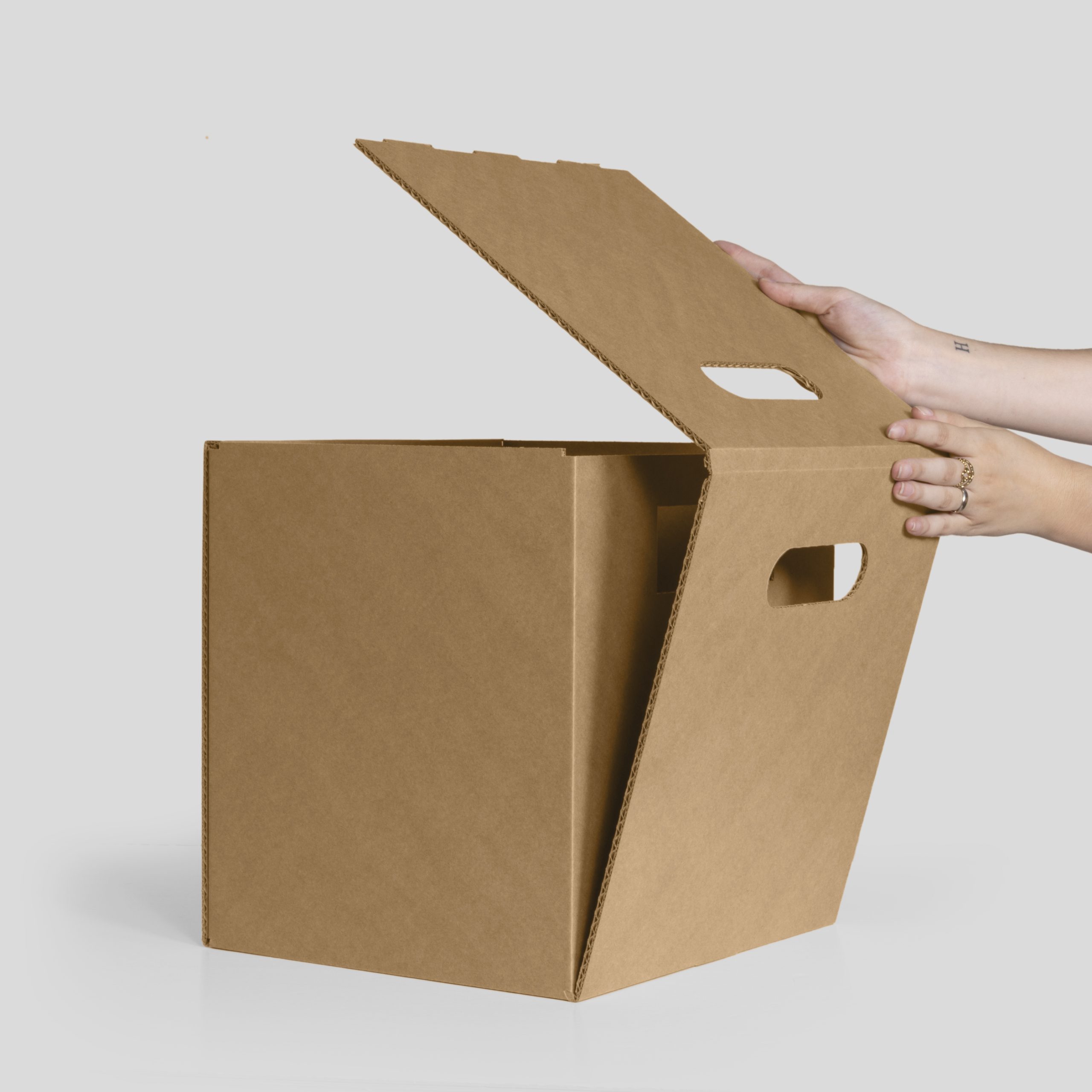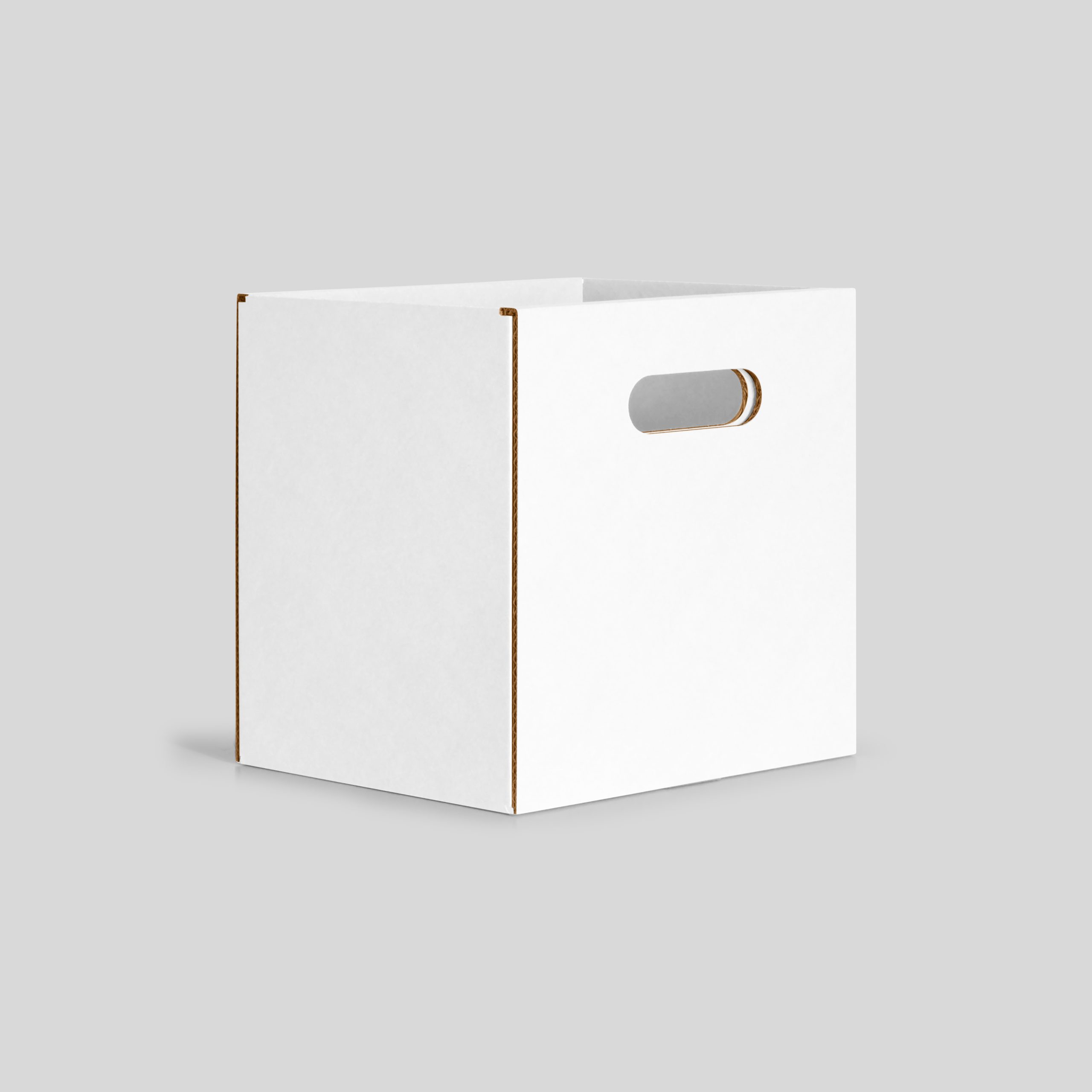 Cajas de almacenaje en cartón. Diseñada específicamente para integrarse con el sistema de estanterías modular OHM. Esta caja con asas es el complemento perfecto para quienes buscan orden y ligereza. Las asas integradas permiten moverla cómodamente, ideal para montajes ágiles y espacios que requieren máxima adaptabilidad. Disponible en acabado kraft, blanco y totalmente personalizable en su versión impresa. Perfecta para espacios de trabajo temporales, stands, oficinas nómadas o zonas de almacenaje efímero.