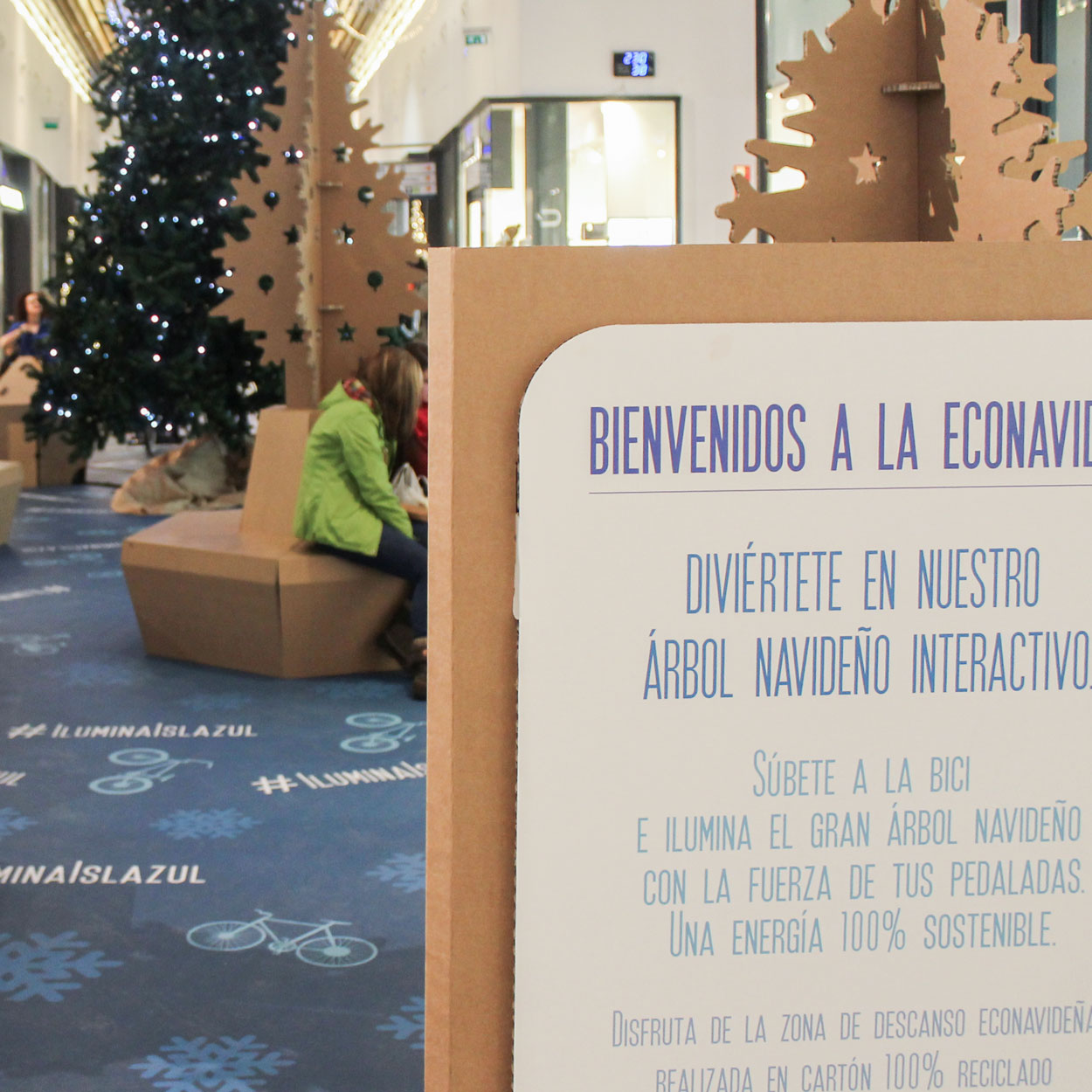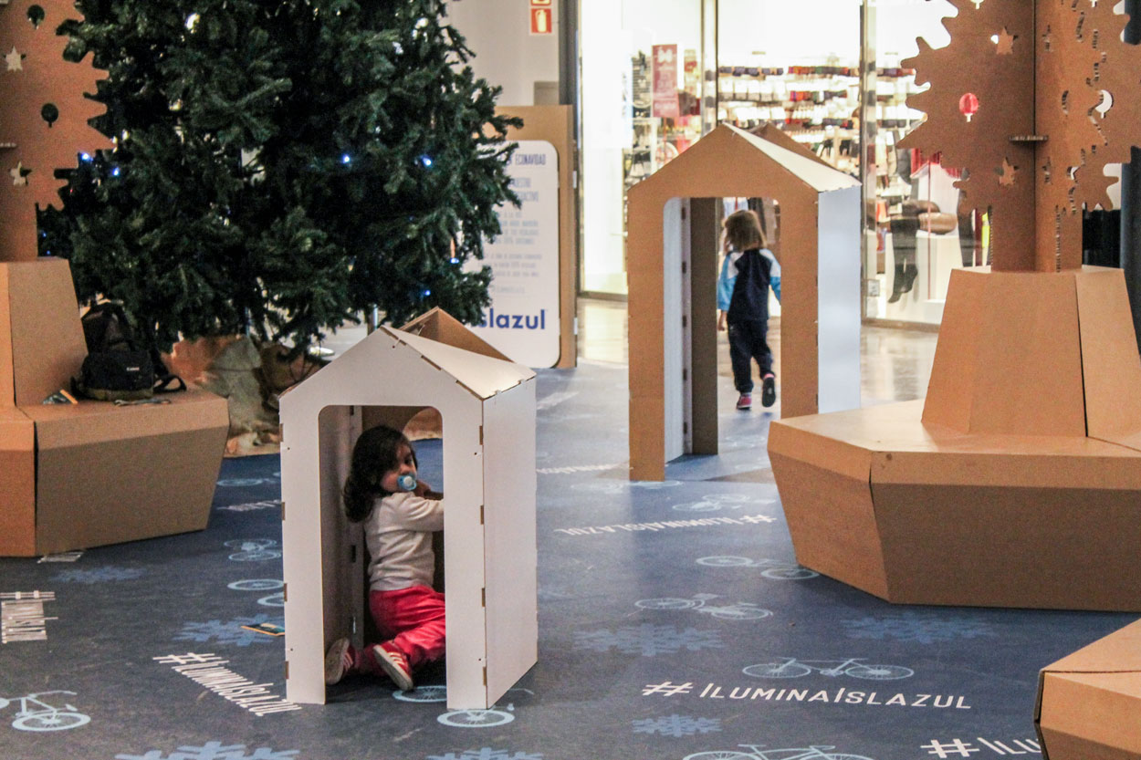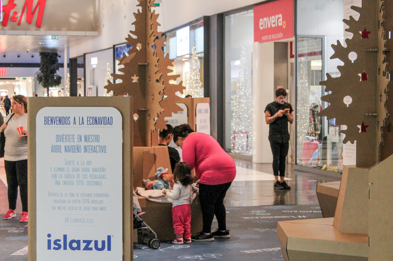 El Centro Comercial Islazul de Madrid decidió apostar por una decoración navideña sostenible. Bajo el nombre de ‘Eco-Navidad’ los visitantes pudieron disfrutar de un gran espacio con diseños producidos en cartón. Desde Cartonlab diseñamos y produjimos una zona de descanso para que los clientes se tomaran un respiro entre compras, incluyendo casitas de cartón infantiles, tótems informativos y bancos-árbol.