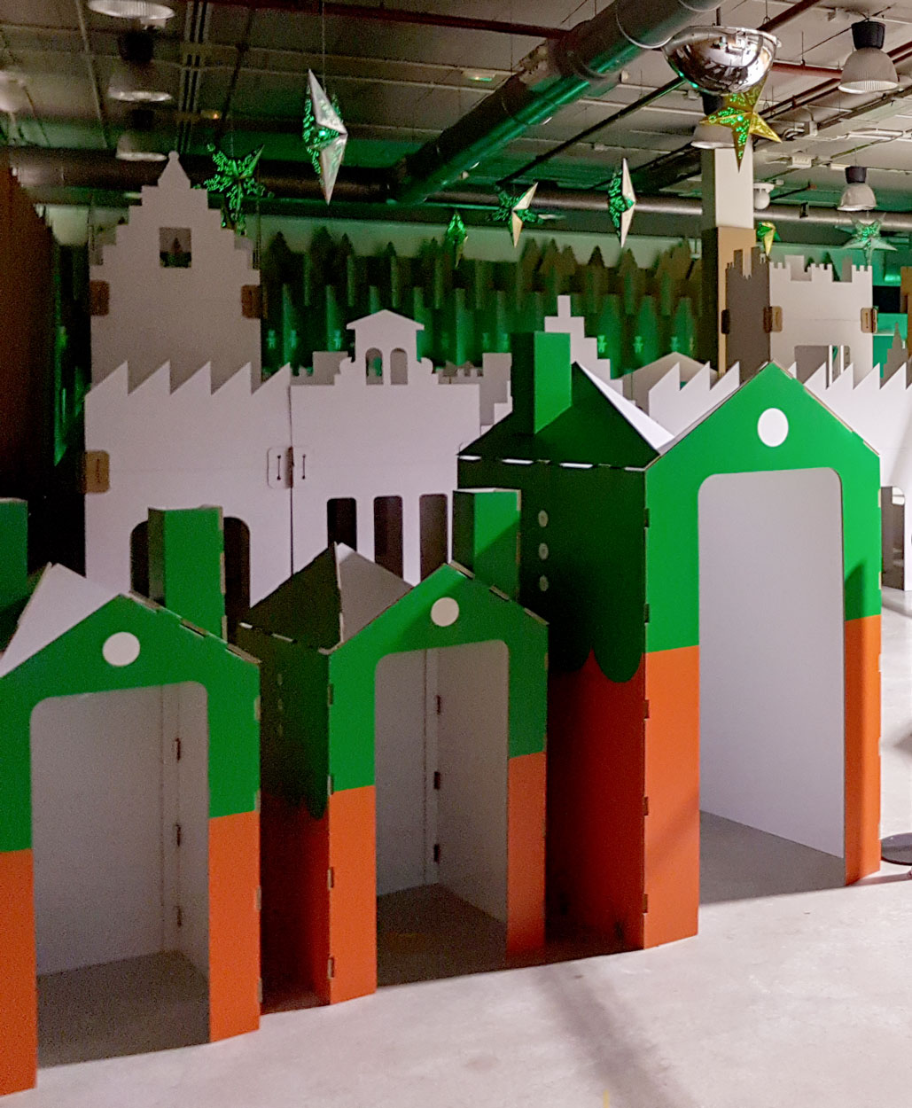 Casitas de cartón para duendes y zona photocall.