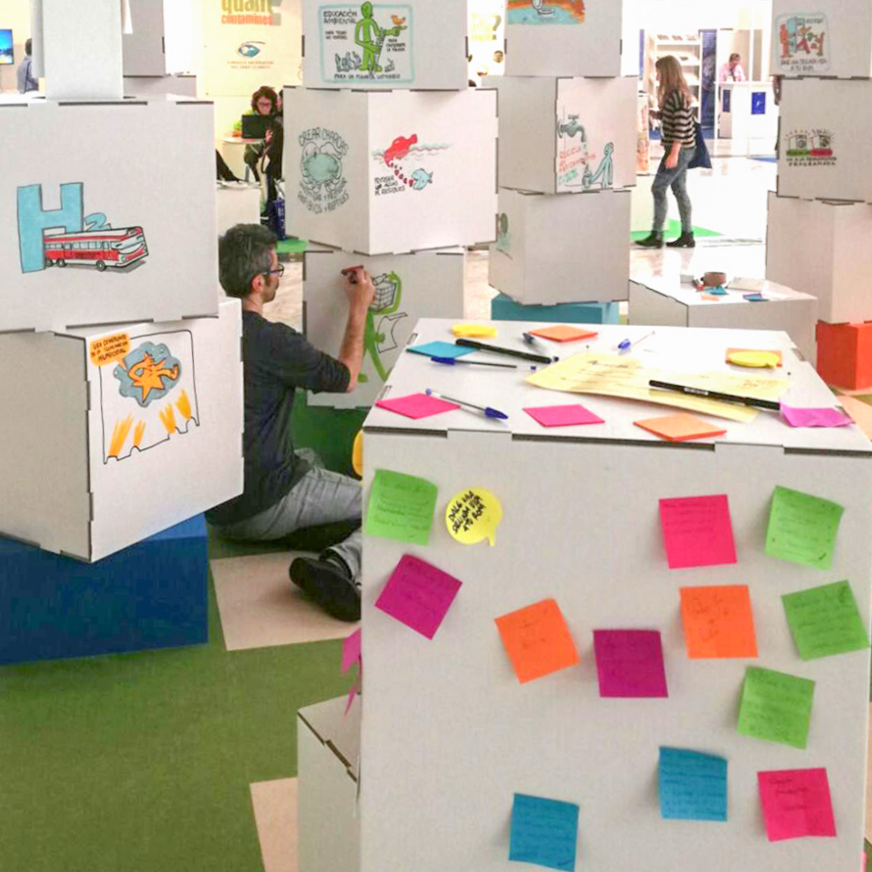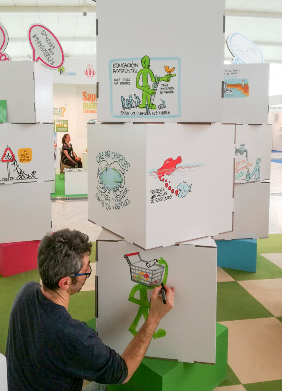 El espacio incluía además una zona de interacción con tótems compuestos por una base de madera y 3 cubos de cartón apilados con acabado en blanco destinados a ser intervenidos durante el evento con todo tipo de mensajes ambientales. Como punto de información, colocamos una mesa redonda y 4 taburetes con acabado blanco.