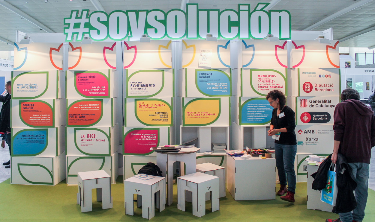 La empresa AdFerial nos encargó materializar en cartón el diseño del stand de la Diputación de Barcelona en Conama. Este incluía una original trasera con 6 columnas de 5 módulos, con forma de prisma encajados en un eje y gráfica impresa relacionada con el medio ambiente. En la parte superior de la estructura, colocamos un corpóreo con el hashtag ‘#soysolución’.