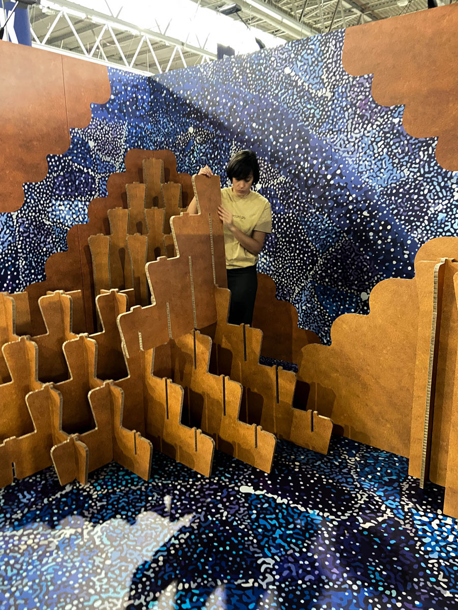 El diseño del stand tomó como referencia la arena roja y las dunas del desierto australiano.