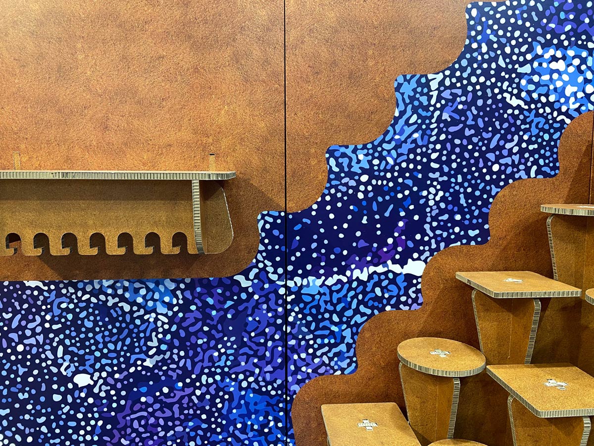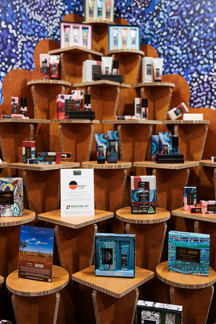 Los expositores escalonados y triangulares evocaban esas formas naturales, mientras los estampados étnicos de las tribus australianas reforzaban la identidad de la marca.