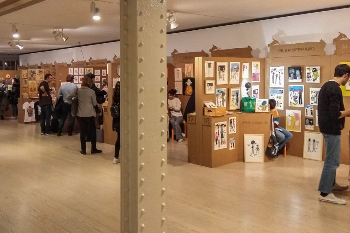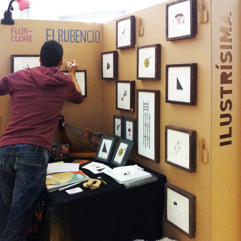 Los stands de esta primera edición de Ilustrísima fueron diseñados en cartón acabado kraft. Los distribuimos en grupos de cuatro. Esto permitía que cada artista contara con dos paredes y una mesa como soporte expositivo. El montaje de la exposición completa se realizó en poco más de dos horas. Una vez desmontada, todos los stands fueron almacenados en plano para su posterior reutilización.