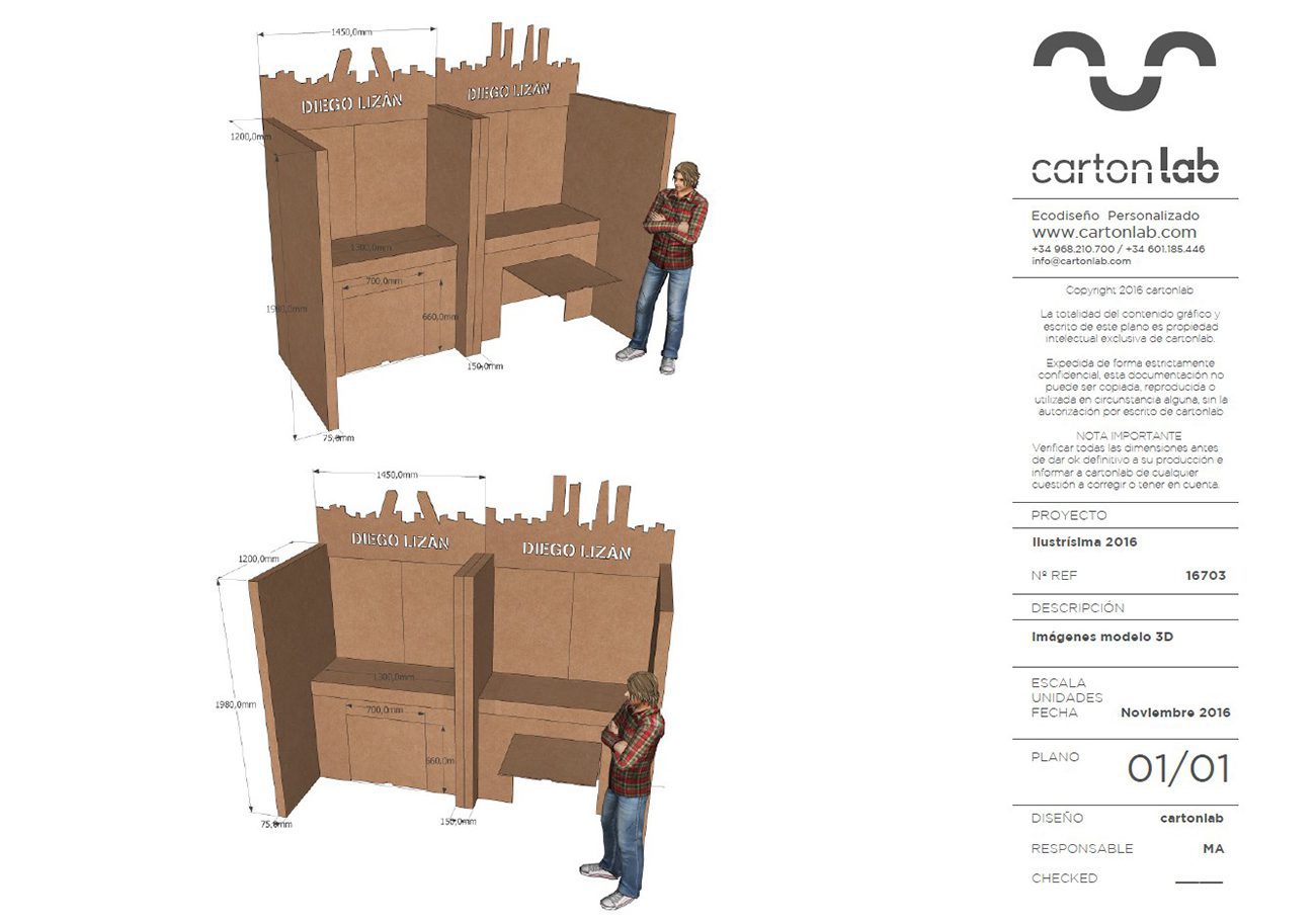 La idea de las cartelas troquelada de la edición anterior triunfó bastante, así que la mantuvimos para 2016 variando los motivos decorativos de cada cartela. En esta ocasión representaban herramientas de trabajo de los ilustradores junto al nombre de cada artista. Además, incluimos un cómodo espacio de almacenaje para obras y materiales, cerrado por una sencilla compuerta.